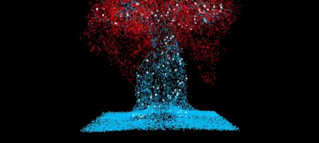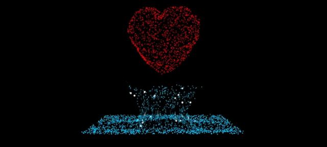 屏幕中央,鲜红色的心脏跳动着,忽然,下面的蓝色砾石一飞冲天,冲散心脏,散落整个屏幕,唯美又浪漫。