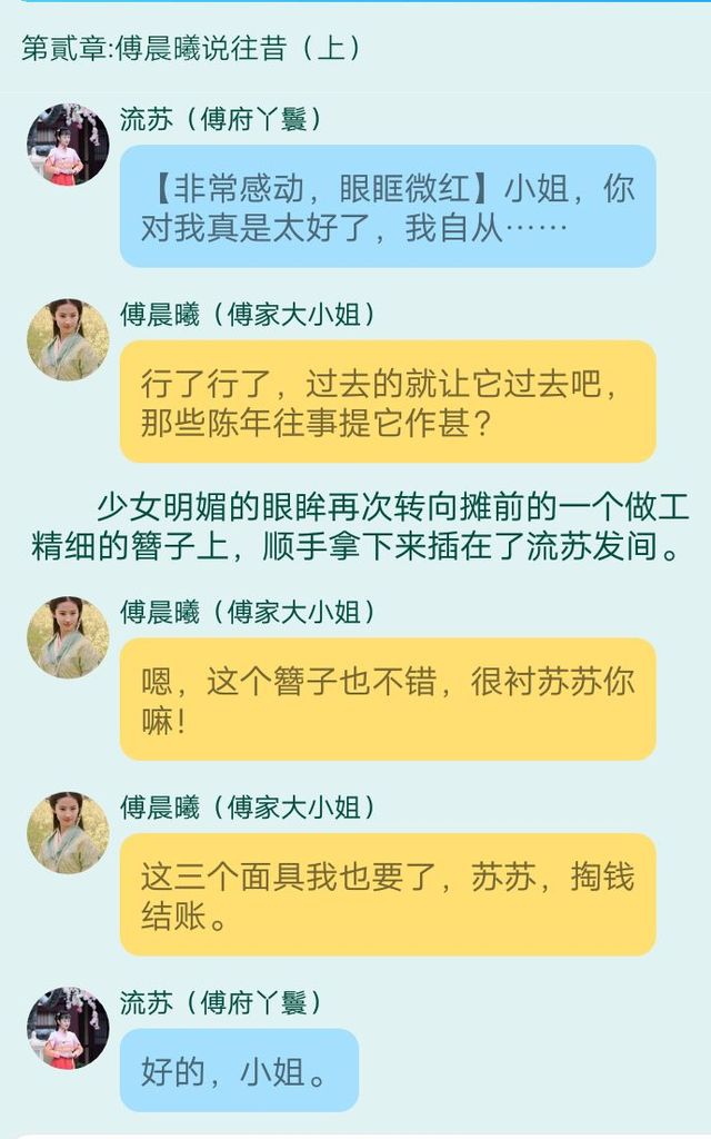 流苏(傅府丫鬟)哼,小姐你还说呢,你都快急死流苏了知道吗?以后不要再丢下流苏一个人了,没人陪着你,这样多危险啊。