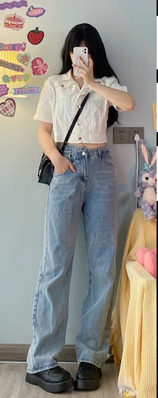 现在是一个换季的日子,马上就到正式的酷暑了,所以天气难免还是有点热,而萧诗情穿了一件纯白较短的上衣,搭配了一条阔腿牛仔裤(参考图下)