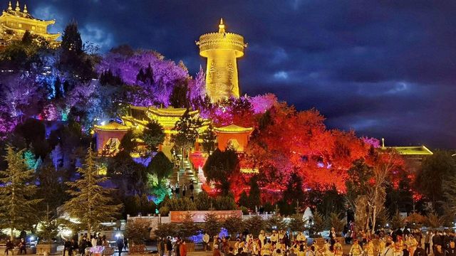 肖赞和朋友一口气跑到了山顶。在独克宗古城大龟山山顶,坐落着一座巨大的由鎏金纯铜筑成的转经筒,铜身高21米,重达60多吨。这座转经筒就是为了纪念香格里拉市更名,建成于2002年的“吉祥胜利幢”,是独克宗古城的标志性建筑物之一。转经筒的外部刻有雪山峡谷、森林草甸、高山湖泊等壮观的美景和藏族文化中寓意吉祥美满的吉祥八宝图。这座巨大的转经筒,需要6、7个成年人合力才能转动。