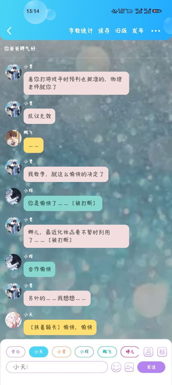 小贵我们都姓王,这是小辉,我的小儿子,语文体育的科任老师。也是班主任,这是娜儿。我的小儿媳,英语,我的二儿子小天,化学,这位是二儿媳燎儿,音乐舞蹈