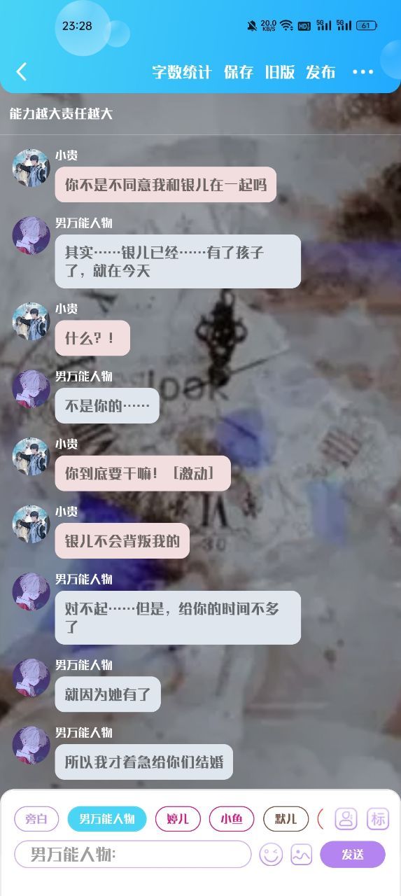 男万能人物我跟你说这些呢。只是觉得……跟你相处了这么长时间。你和银儿是真心相爱的。银儿昨天还没有感觉,今天有的感觉。所以七天之后,这个宝宝就会出生,你如果和银儿是真心相爱的,那你在五天后,一定要去看看