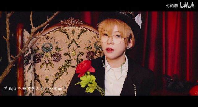 黑色的礼帽上别着扑克牌,金丝边眼镜垂下一根金链,嘴里叼着红玫瑰。