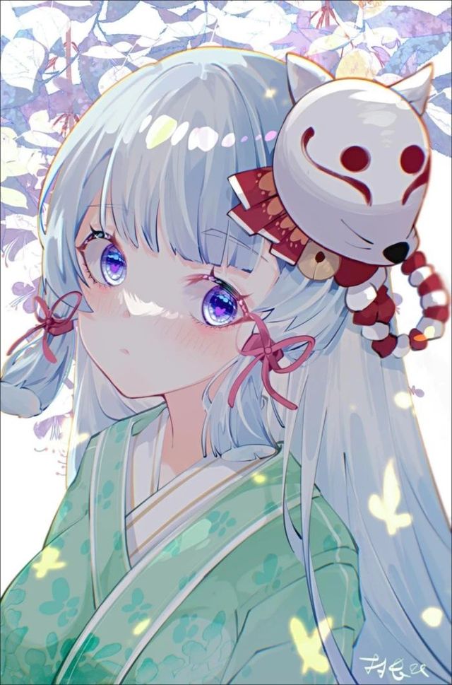 少女一绺蓝色的秀发微微飞舞,一缕头发用珍珠样制品梳了起来,细长的柳眉,一双眼睛流盼妩媚,秀挺的瑶鼻,玉腮微微泛红,娇艳欲滴的唇,洁白如雪的娇靥晶莹如玉,如玉脂般的雪肌肤色奇美,身材娇小,温柔绰约,眼晴仿佛会说话,让人一眼就沦陷了进去。