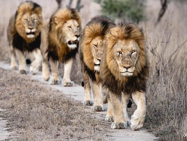狮群迈着散漫的步伐,整齐有序的由领头狮子带领着,气势昂扬的围起竞技场