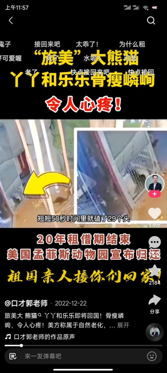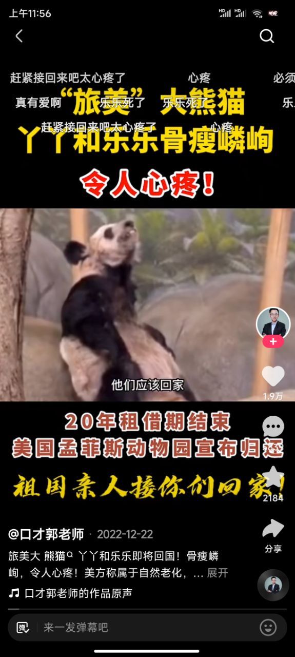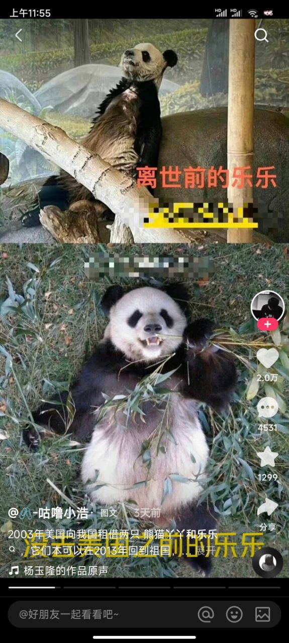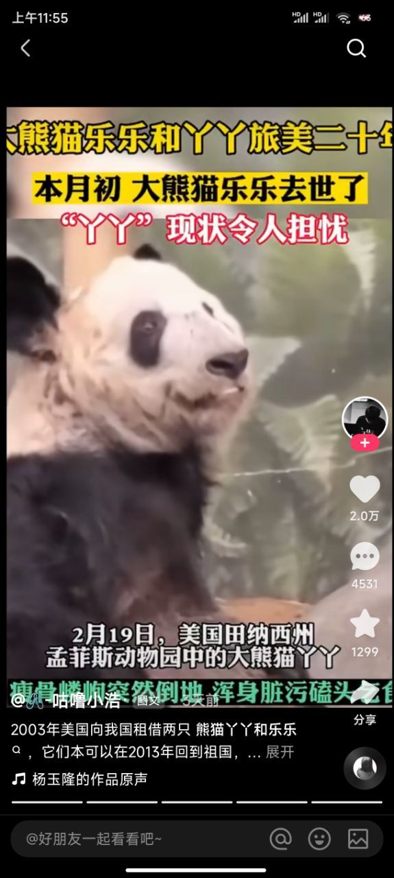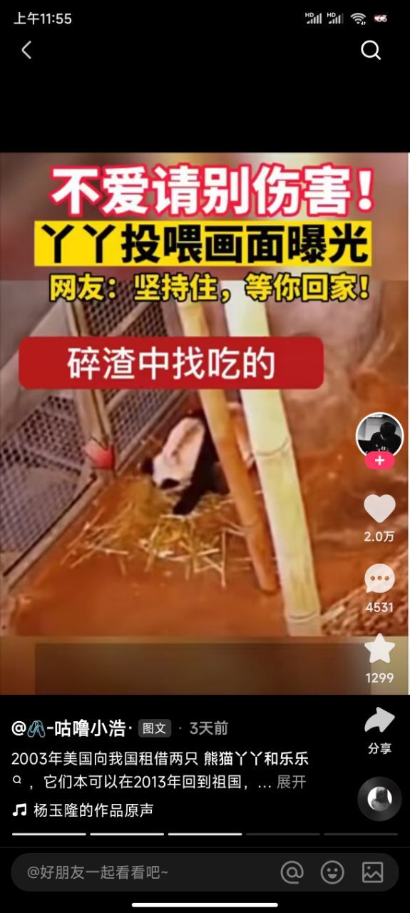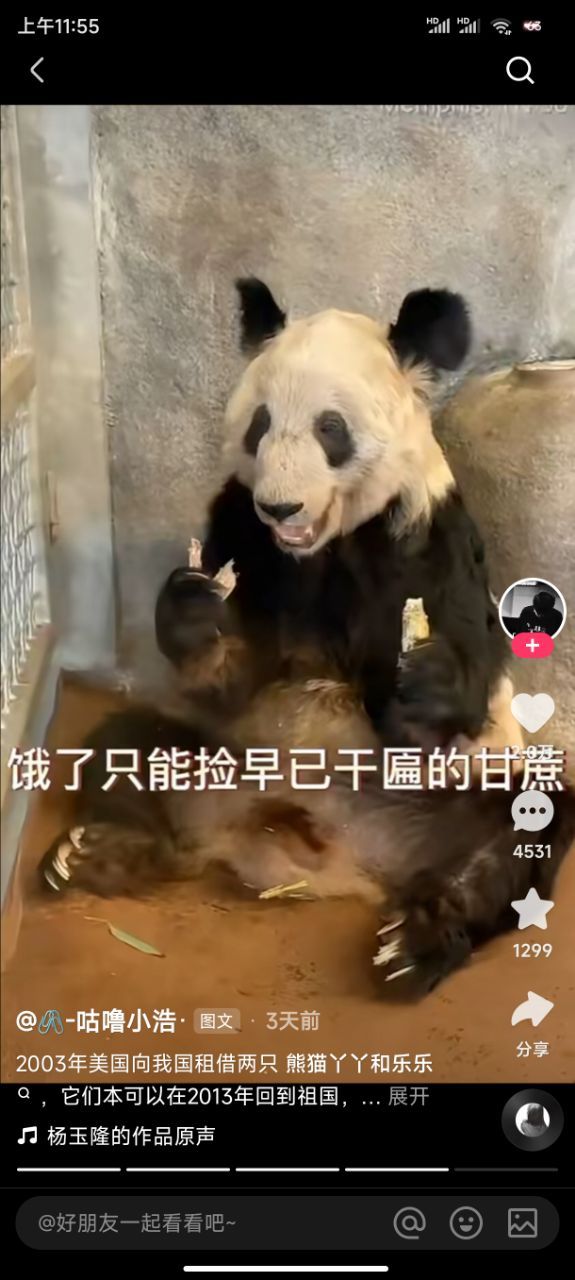 作者傻×美国虐待熊猫,乐乐已经死了,丫丫不知道还能不能坚持住,傻×美国给的回答是死因不明,看了照片说实话挺心疼的,饿的骨瘦如柴,又脏又瘦,众所周知熊猫吃的百分之九十的食物是竹子,每只熊猫每天吃十七亩的竹子,而美国动物园只有十亩,而且还是两只熊猫,不止如此垃圾美国还把那十亩竹子卖给别人,看了视频了丫丫他们在一堆碎渣里找吃的,甚至磕头才能换来一点点饼干?我想问你是人了吗?虐待这么可爱的熊猫??道德败坏的畜生。