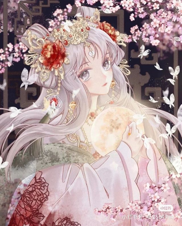 灰紫色的眼睛犹如漩涡,可以将人卷进去,一但被卷进去便万劫不复,浅紫色的长发随风而舞,身穿粉白古风裙,四周有蝶围绕着她。