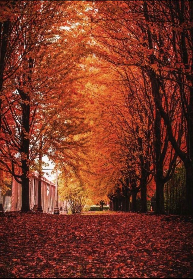 踩上了铺满的厚原的金黄色叶子很舒服,一排排高大的树木