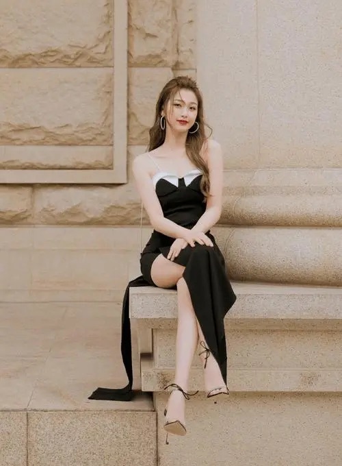 只见亓阮阮一改往日甜美可爱的形象,换了一套黑色吊带高开叉连衣裙,还挂上了夸张的耳饰