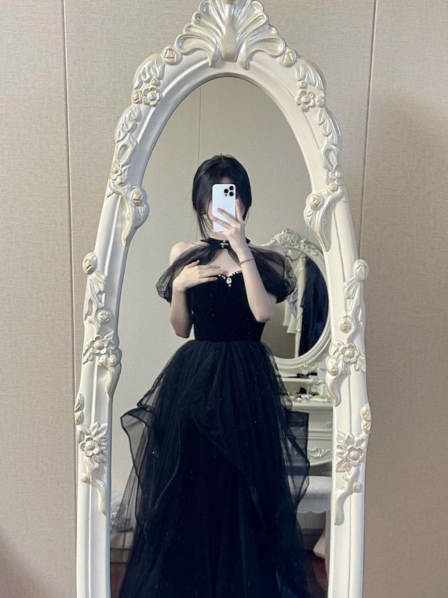 李盼桑又看中了一套黑色礼服,小吊带,挂脖设计,胸前还有钻石。