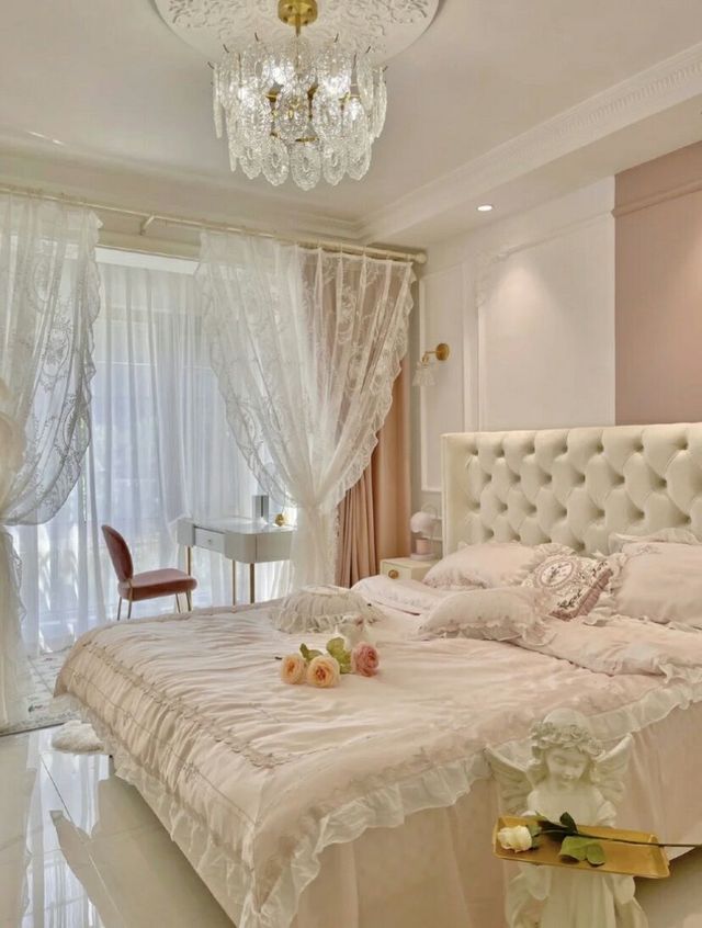 顶部挂着水晶吊灯,淡粉色的大床就在其下方,梳妆台被摆放在窗边,蕾丝纯白窗帘搭配落地窗,氛围感真的是美绝了。