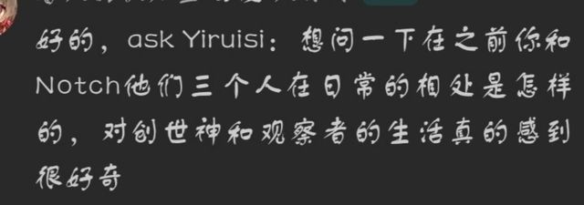 YiruisiNotch呢他不是在想创造出个生物来,就是在想这个生物应该会干些什么和他的一些作用,有时也会应为世界出现一点错误而连夜加班。以前的我不是在帮他改善一下他的创作物就是在修改一些代码什么的,虽然那些代码操作我是真的搞不懂就是了(摊手)