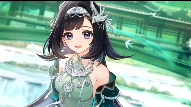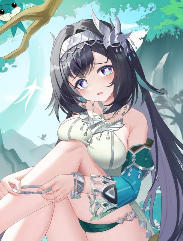 “旅行者和她的伙伴派蒙,还有香菱,你们好!”蓝砚招手道,一头黑发长发带绿色挑染,紫绿渐变瞳色,身穿绿色基底的服饰以及银饰,身体轻微摆动,蓝砚身上的银饰相互碰撞,发出一声声清脆悦耳的银铃,这时候的她,如同山间飞翔的燕子,自由自在。