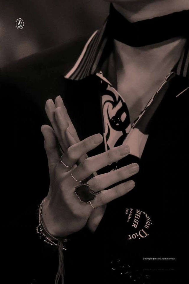 黑色花样衬衫,挺拔的身姿,手上佩戴的黑宝石戒指是今年某香新品,尽显奢华高贵。