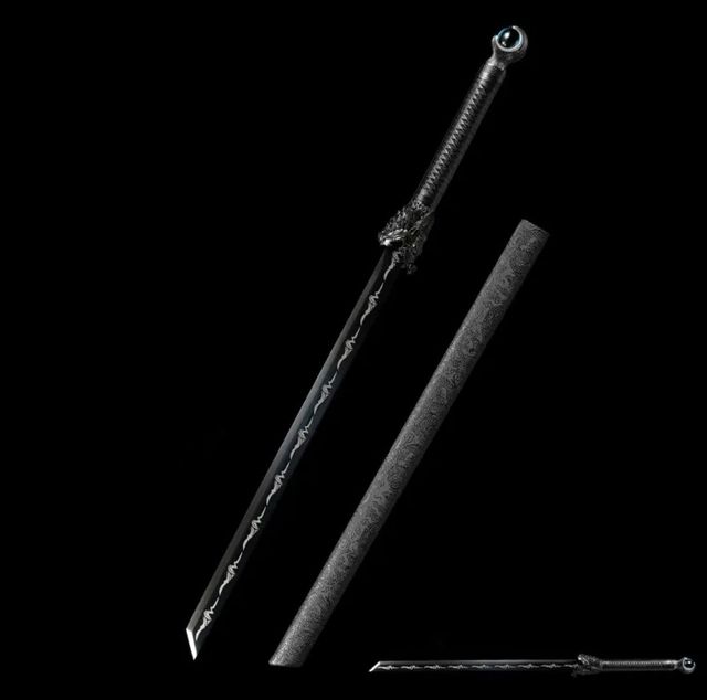 最终他的眼睛定格在一把黑色的宝刀上,刀镡是一颗蓝色的亮珠,刀格是一个龙头张着嘴,他喜欢极了