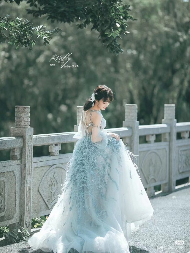 钟乐倾选的这套外景纱是浅蓝色的仙女裙,裙摆上还带着蓝色的羽毛,拍出来的照片真的很好看
