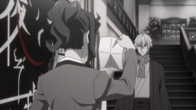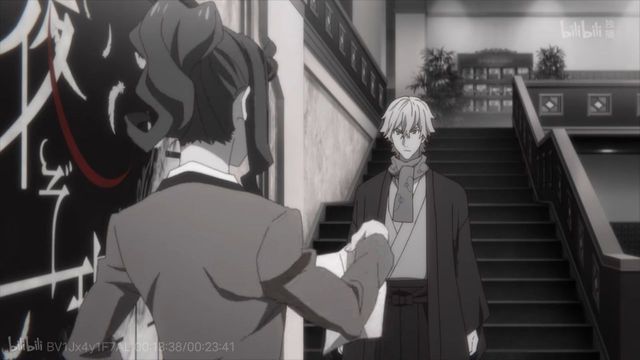 江户川乱步和福泽谕吉站在大厅中央,福泽谕吉表情有点失控,大概没想到又碰到了吧,江户川乱步到是一脸高兴的向扎西德勒挥手。