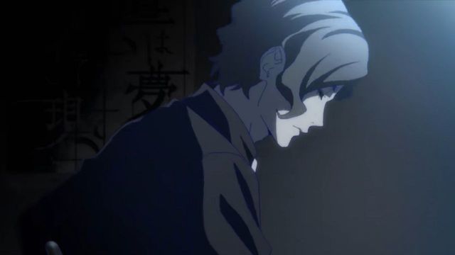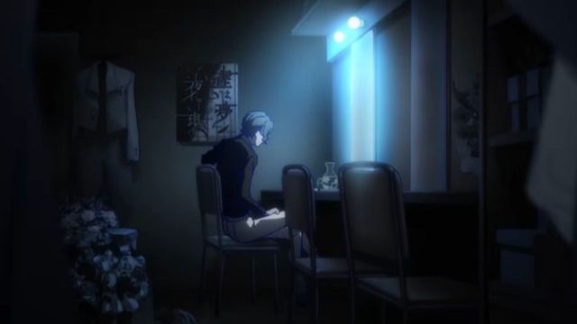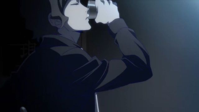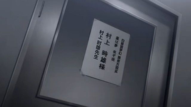 室内很黑,只开了一盏蓝色的灯,墙上各处贴着舞台剧的宣传海报,村上时雄翘着腿坐在椅子上,微弱的灯光打在他身上,桌子上只放着剧本和一大杯水,村上时雄丝毫没有收到恐吓信后紧张害怕的样子。