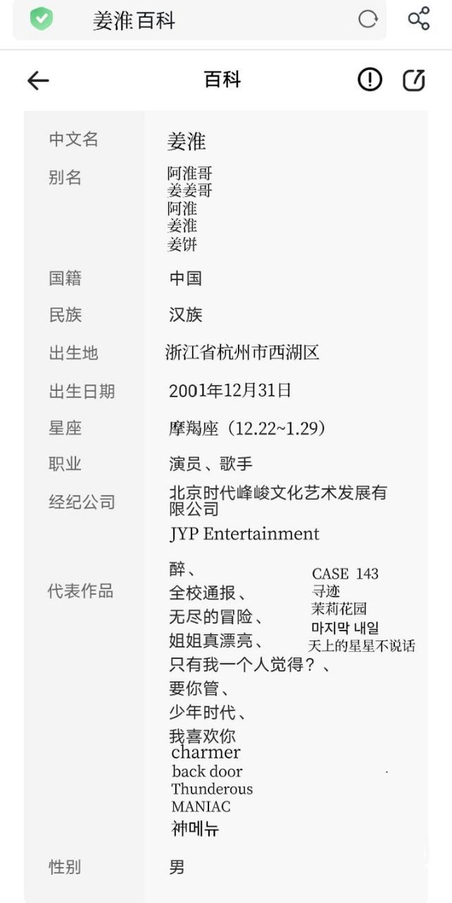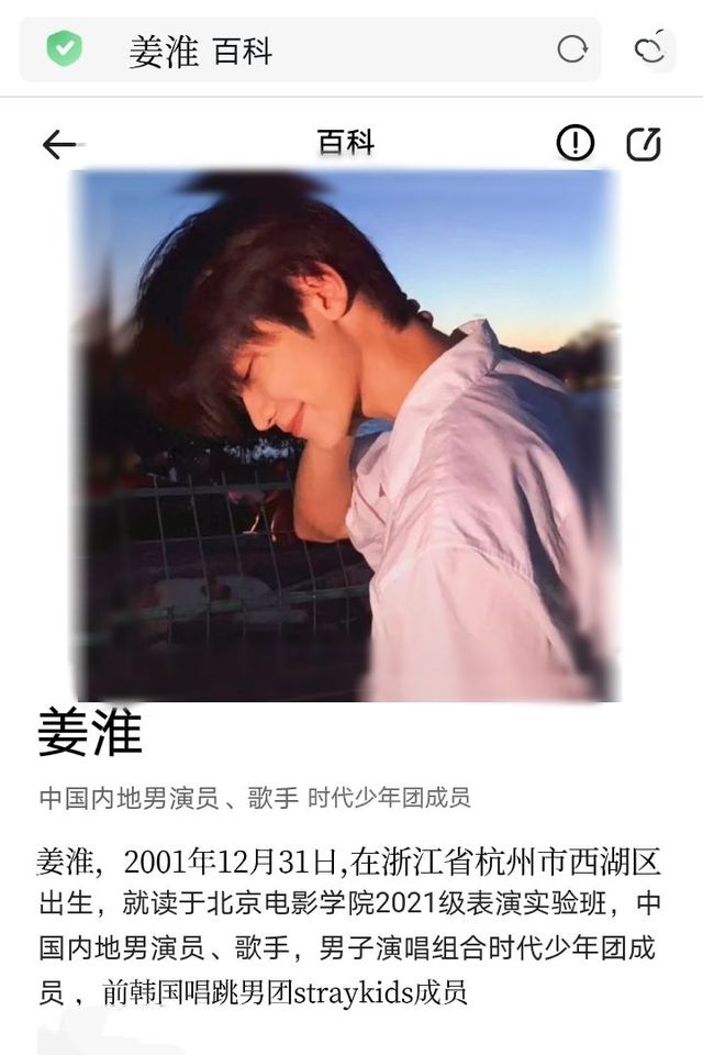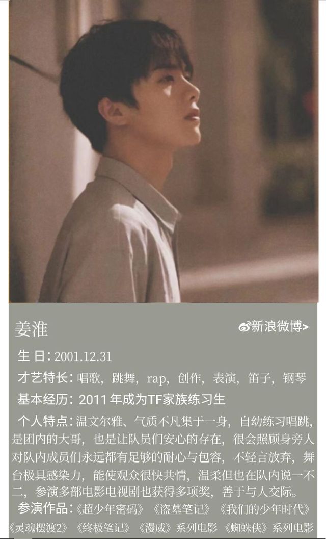 姜淮[강호],2001年12月31日,在浙江省杭州市西湖区出生,就读于北京电影学院2021级表演实验班,中国内地男演员,歌手,男子演唱组合时代少年团成员,韩国唱跳男团starykids成员。