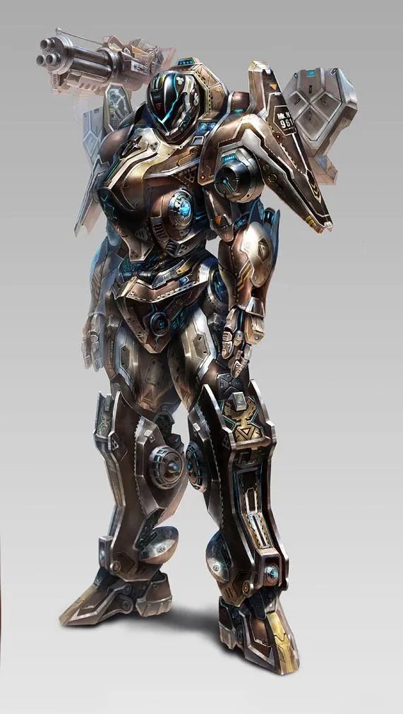 乒~机甲的右肩膀处探出一把棕色的加特林;身后的弹药舱展开,打开的弹药舱如同一朵鲜花一样绽放,每朵花瓣上都布满了几百枚小型炮弹