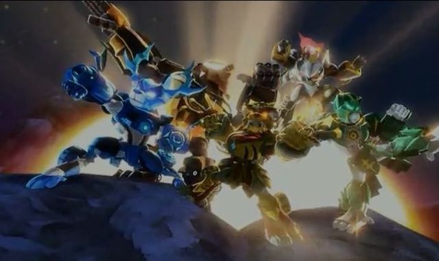 战场上,金、绿、蓝、红、棕五色交织形成了一个巨大光柱。