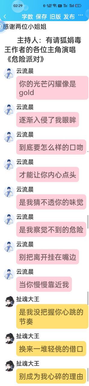 主持人:有请狐娟毒王作者的各位主角演唱《危险派对》