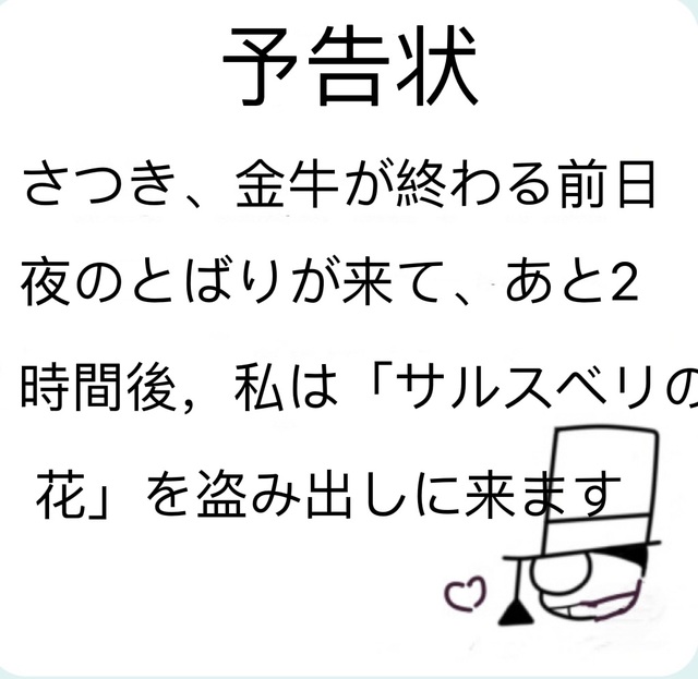 中文: 皋月,金牛结束的前一天,当夜幕降临,再两个时辰后,我将前来盗走“紫薇之花”