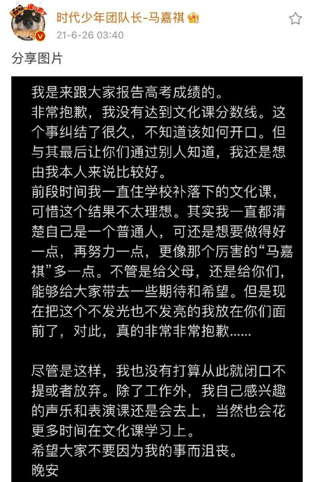 (首先要感谢贺哥没让咱马哥自己查成绩,并且向全世界宣告马嘉祺成功了.其次,要恭喜咱们的马哥!过去的一年里,辛苦了!)
