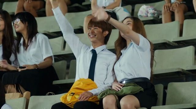 Team站在比赛台上,他的闺蜜团给他加油助威。