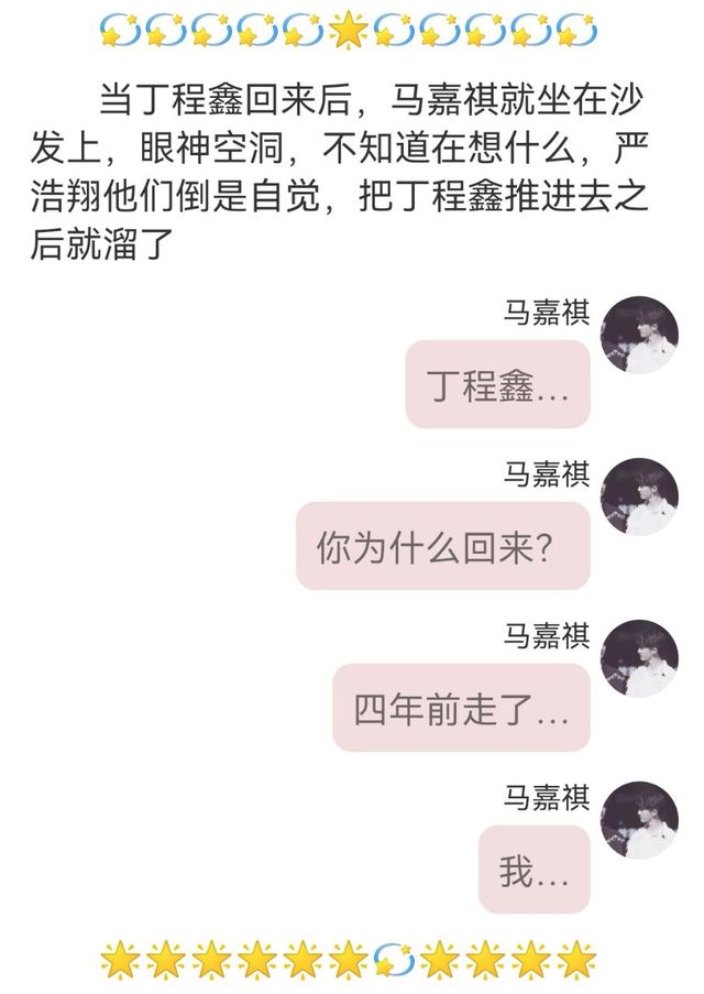 马嘉祺丁程鑫…你知不知道啊?在你走之后的三年里,我每天晚上都睡不着,你知道为什么吗?因为我猜…是因为团内现在不好,你才想走,我努力把团做好,做得更好,想让你回来。可是当我得知,你是抛下了整个团,去和一个女人结婚,我的心有多痛吗?世界在那一刻仿佛都是空白,你走时我有多爱你,当时我就有多崩溃