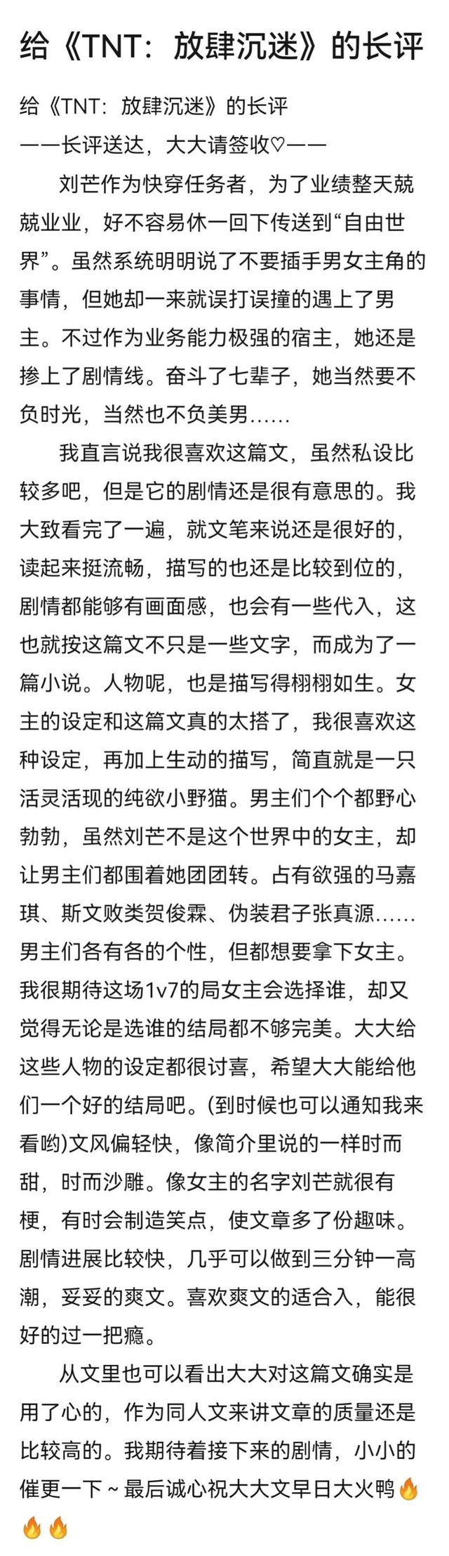 #长评#刘芒作为快穿任务者,为了业绩整天兢兢业业,好不容易休一回下传送到“自由世界”。虽然系统明明说了不要插手男女主角的事情,但她却一来就误打误撞的遇上了男主。不过作为业务能力极强的宿主,她还是掺上了剧情线。奋斗了七辈子,她当然要不负时光,当然也不负美男……/我直言说我很喜欢这篇文,虽然私设比较多吧,但是它的剧情还是很有意思的。我大致看完了一遍,就文笔来说还是很好的,读起来挺流畅,描写的也还是比较到位的,剧情都能够有画面感,也会有一些代入,这也就按这篇文不只是一些文字,而成为了一篇小说。人物呢,也是描写得栩栩如生。女主的设定和这篇文真的太搭了,我很喜欢这种设定,再加上生动的描写,简直就是一只活灵活现的纯欲小野猫。男主们个个都野心勃勃,虽然刘芒不是这个世界中的女主,却让男主们都围着她团团转。占有欲强的马嘉琪、斯文败类贺俊霖、伪装君子张真源……男主们各有各的个性,但都想要拿下女主。我很好奇这场1v7的局女主会选择谁,却感觉无论是选谁的结局都不够完美。大大给这些人物的设定都很讨喜,希望大大能给他们一个好的结局吧。(到时候也可以通知我来看哟)文风偏轻快,像简介里说的一样时而甜,时而沙雕。像女主的名字刘芒就很有梗,有时会制造笑点,使文章多了份趣味。剧情进展比较快,几乎可以做到三分钟一高潮,妥妥的爽文。喜欢爽文的适合入,能很好的过一把瘾。从文里也可以看出大大对这篇文确实是用了心的,作为同人文来讲文章的质量还是比较高的。我期待着接下来的剧情,小小的催更一下~最后诚心祝大大文早日大火呀🔥🔥🔥