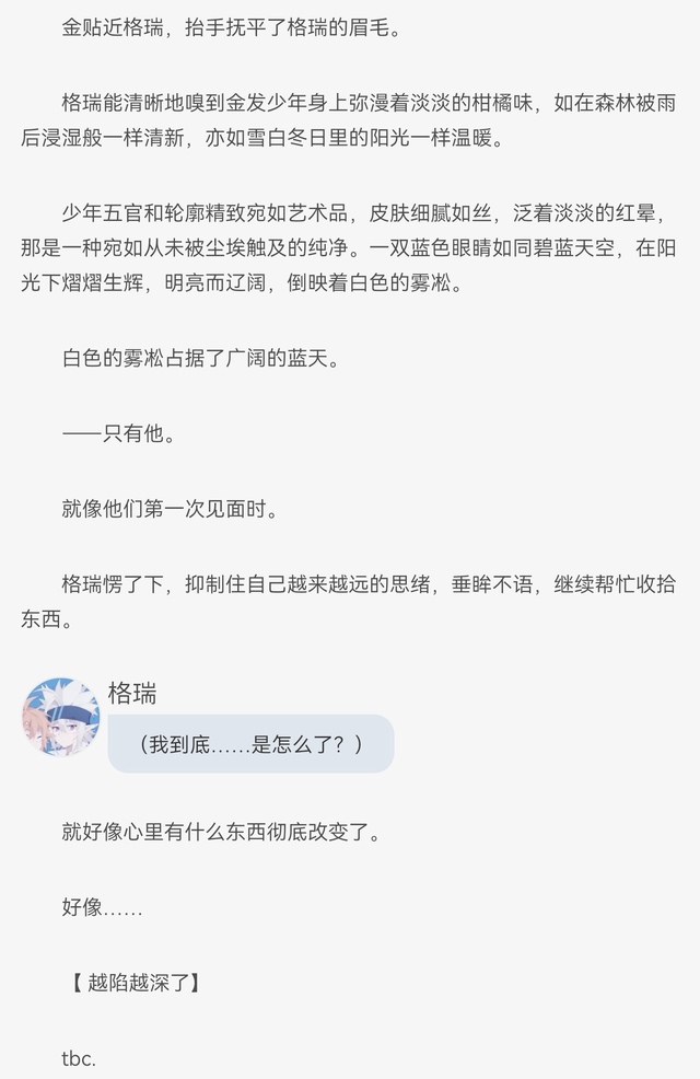 格瑞没出声,他发现这个金发女孩每次在提到"金"的时候就会非常开心,眼里的温柔完全掩饰不住。
