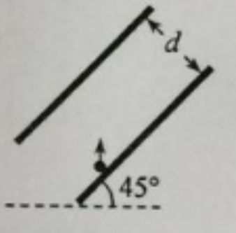平行板电容器两极板的间距为d,极板与水平面成45°角,上极板带正电。一电荷量为q(q>0)的粒子在电容器中靠近下极板处。以初动能 E k0 竖直向上射出。不计重力,极板尺寸足够大,若粒子能打到上极板,则两极板间电场强度的最大值为