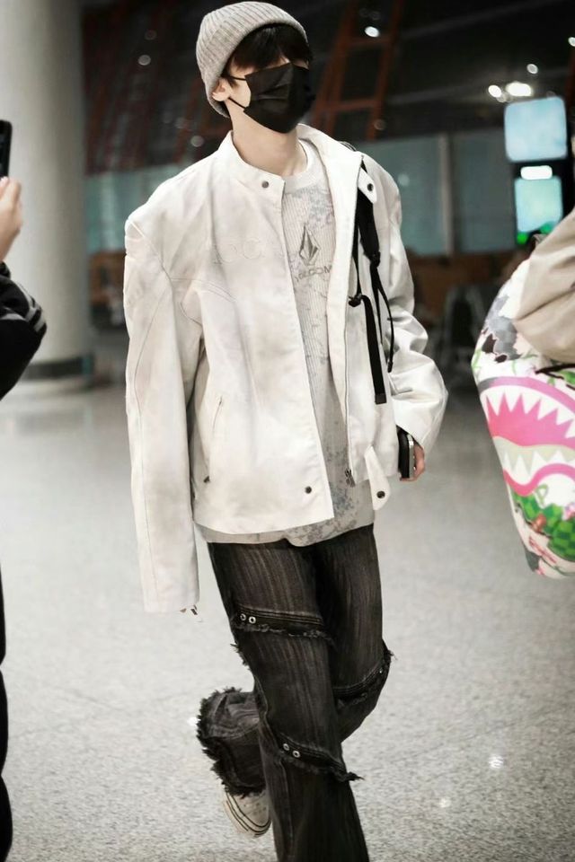 机场内的一个男生穿着黑色裤子,白色外套,往机场外走着。