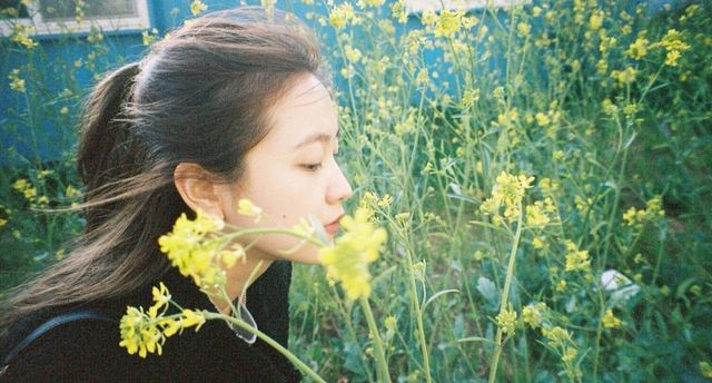 司玳来到花田里,轻柔地嗅闻着花的香气。