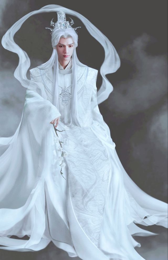 银白色的长发半散在身后,被镶嵌着蓝玉的精致发冠束起,一袭雪色的广袖华袍,绣亦银色符文,缀以银饰流苏。