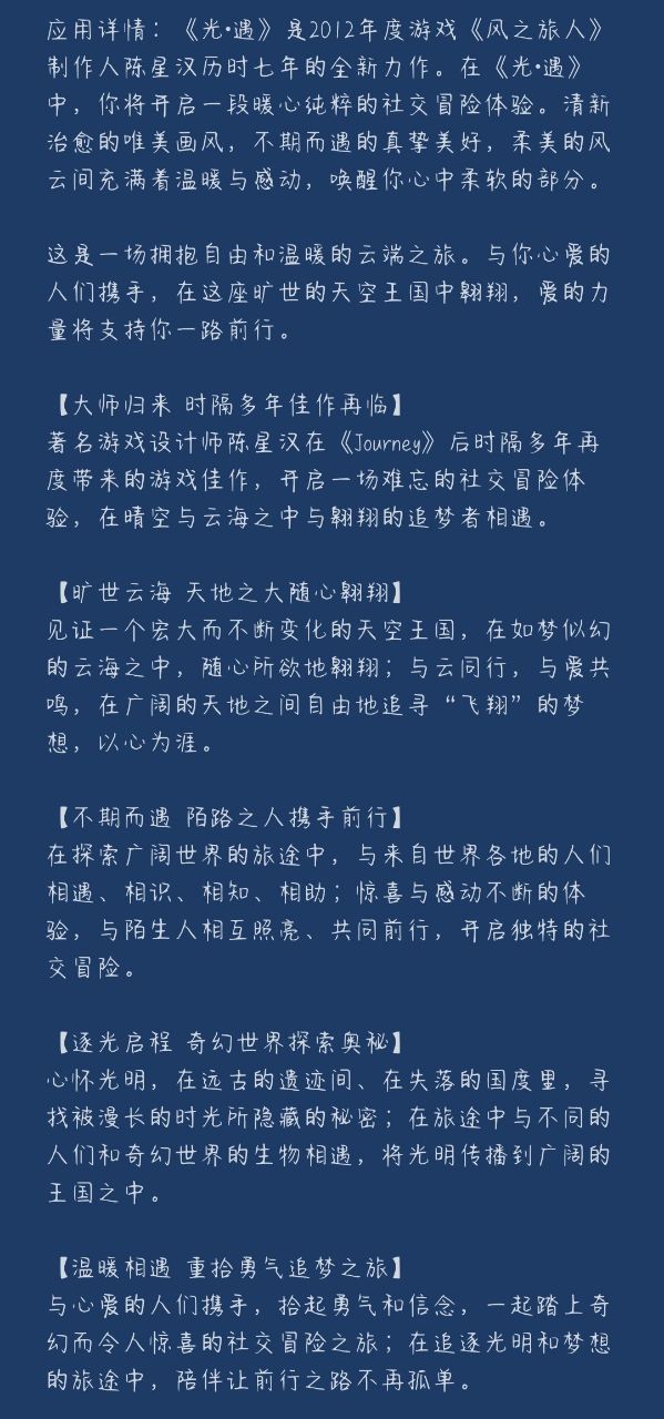 “这么看‘光遇’是这个游戏的名字了。”他点开光遇,最先浮出的是一个简介: