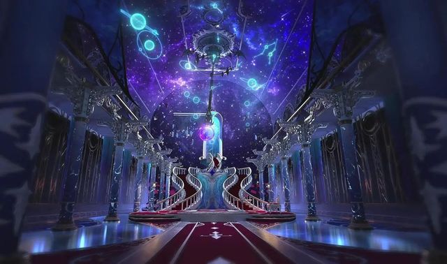 上方是一望无际的星空,常伴有流星滑过,地面上有八卦阵图。宫殿里的布置那S型的楼梯,直通大门,黎灰从上面走下来自带王者风范。