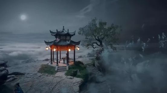 山顶云雾缭绕,连明亮皎洁的月亮都蒙上了一层薄纱。