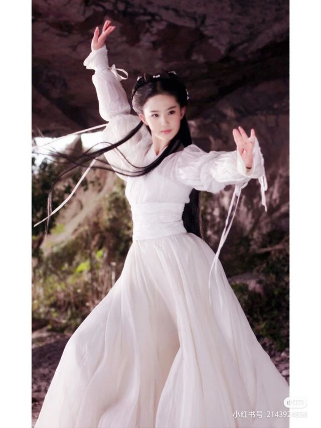 作者年酱阿冰日常装扮,参考小龙女的衣裙,如果是穿着宽袖的长裙,里面的白绫(白绸)就可以飞出来打人。