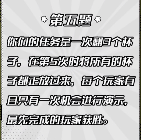 等所有人把抽屉里的杯子拿到桌面上并且摆好之后,导演组公布了第五题的任务