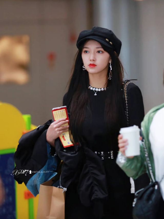 一个身着黑色上衣,头戴黑色贝雷帽,眸眼如水的女生从报告厅走出来。
