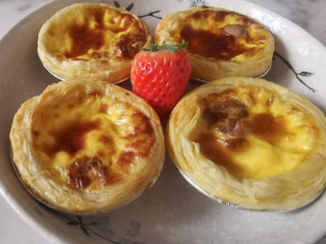 (PS:图中蛋挞是我今天做的,中间摆个草莓是因为觉得比较好看,因为要发朋友圈,小说,大家就不要较真哈,配图凑合着看)