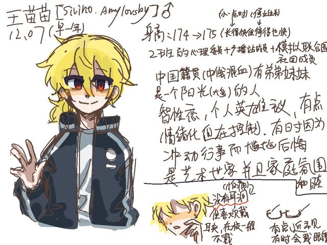 文科班的阳光逼,之前不会用王苗苗这个名字在被老师说在中国就应该用中文名后并且抵抗无效后开始用王苗苗这个名字,还因为这个被别人觉得装模装样被说过。来自艺术世家,中俄混血中国人,没上国际部因为母亲觉得还是中国的学习模式好,家庭比较和睦,王苗苗有弟弟妹妹,但因为一些状况王苗苗偶尔会很emo负能量爆棚本身又是一个比较冲动的人就会做出过激行为。可以说是交际花和很多人都认识,认识很多人但又隐隐约约感觉有距离感,莫名其妙受同性的欢迎,因为某些人导致生理上的崆峒,到了会呕吐的地步,在改善中。他觉得自己不应该对取向这么刻薄,但他身体不自觉的会觉得恶心。【除了某人外捏】