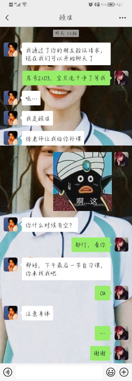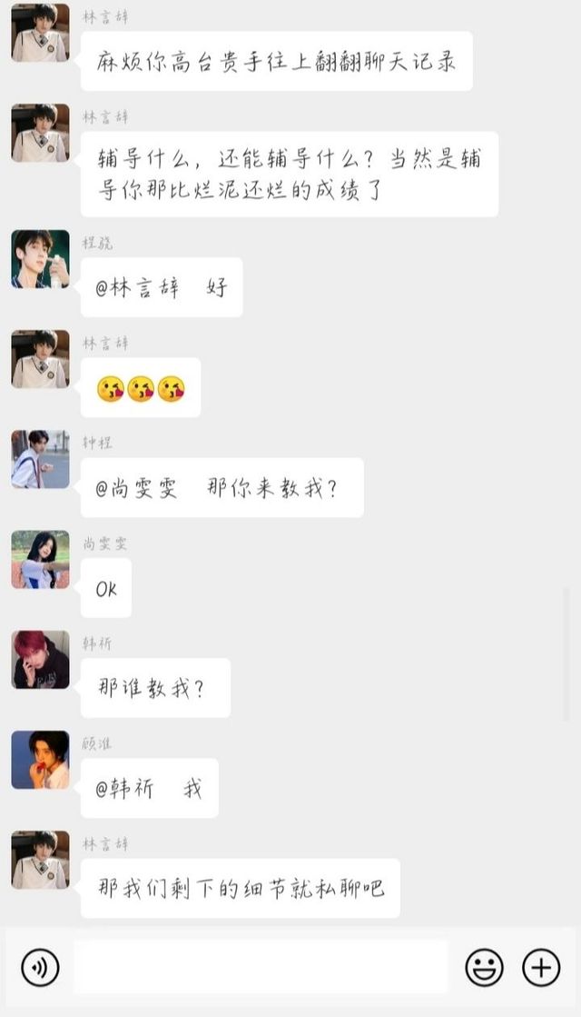 顾淮一想到自己要辅导韩祈就感到头大,但是答应了徐老师也没办法拒绝,只好在群里加上韩祈的微信,商量今天补习的事宜